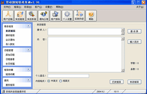 特色应用:实现国家劳动部的内部办公系统,实现电子移动办公。国家劳动部通过短信系统实现对内部发送办公短信、进行短信会晤、同时可以设置领导短信日程提醒等功能。